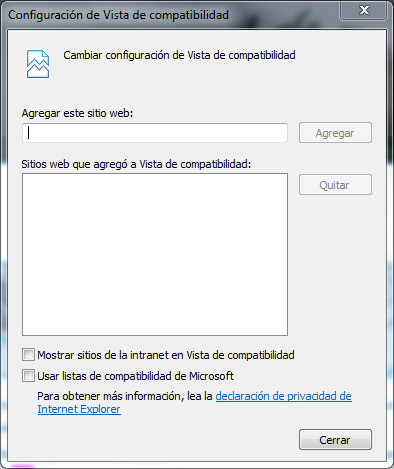 En Internet Explorer, abre o menú "Herramientas" e elixe "Configuración de Vista de compatibilidad". O cuadro de diálogo que aparece deberá estar como na imaxe superior